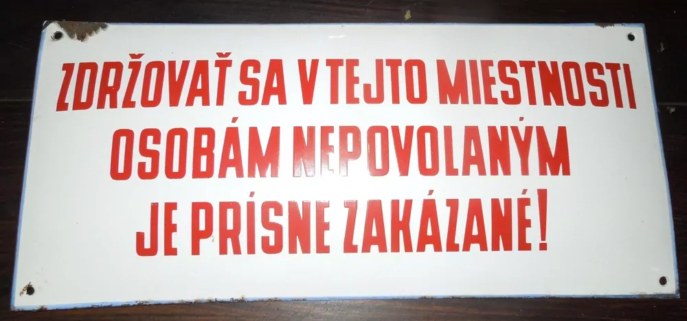 - PLECHOVÁ SMALTOVÁ CEDULE ZDRŽOVAT SE V TEJTO MIESTNOSTI OSOBÁM NEPOVOLANÝM JE PRÍSNE ZAKÁZANÉ !